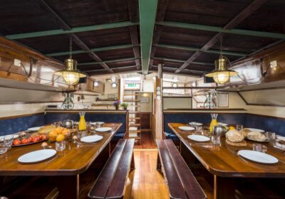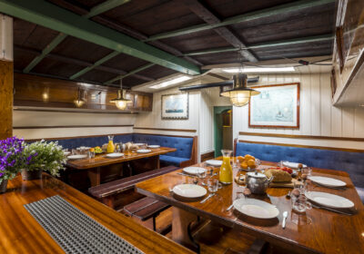 Es mangelt an nichts: die Kabinen sind mit guten Betten sowie warmem und kaltem Wasser ausgestattet, und an Bord gibt es zwei ausgezeichnete Duschen und Toiletten. Der gemütliche Tagesraum bildet das Herz des Schiffs, wo du dich zu den Mahlzeiten versammelst oder nach einem Tag auf dem Wasser miteinander plaudern kannst.