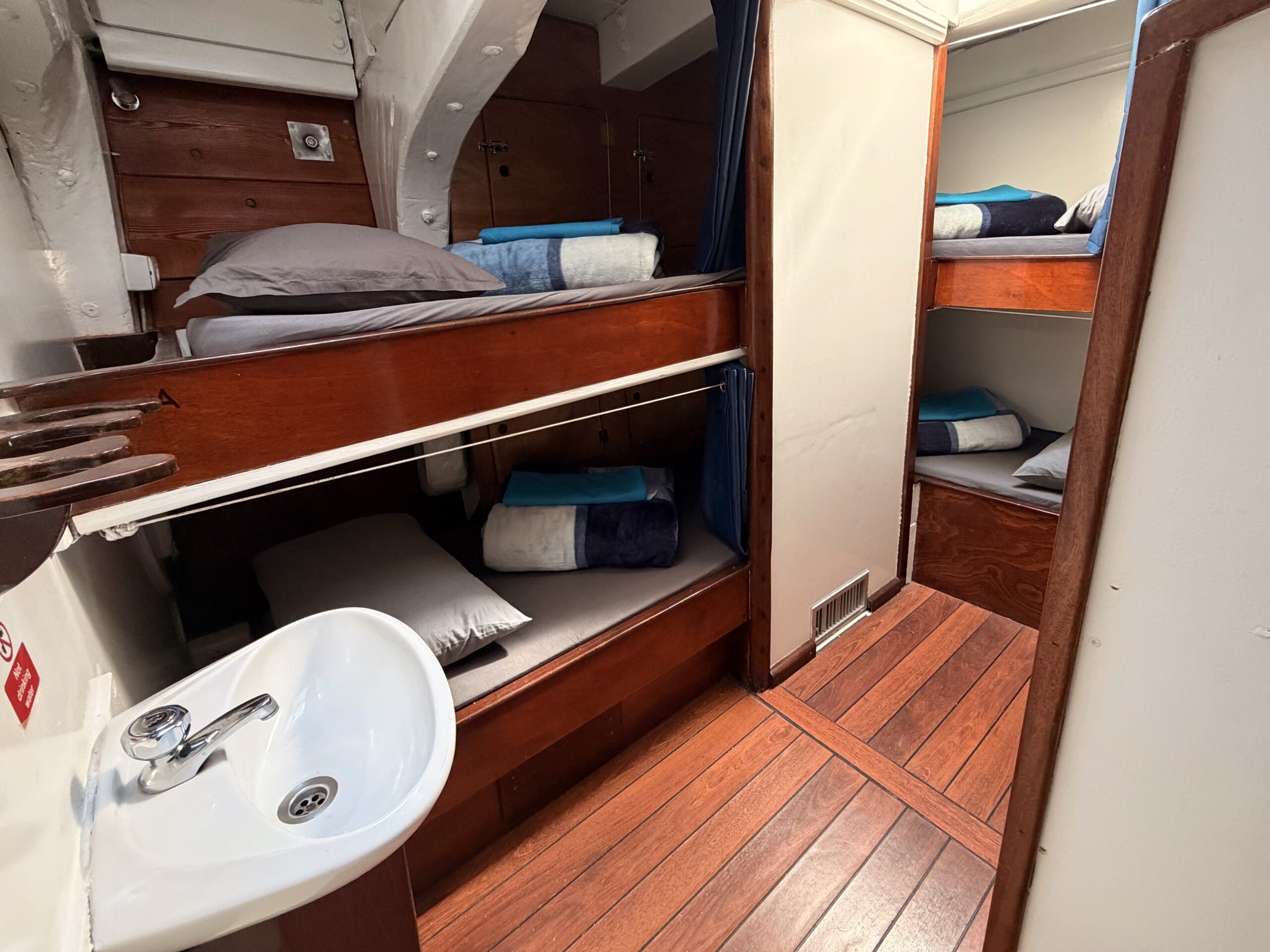 Alle Mitsegler teilen sich insgesamt vier Toiletten und drei Duschen. Eine weitere Dusche an Deck lädt dazu ein, sich nach dem Schwimmen im Meer abzuspülen. Auf einigen Reisen erhalten junge Menschen unter 30 die Möglichkeit, ein echtes, authentisches Piraterieerlebnis zu erleben, indem sie in einer Hängematte schlafen, die zwischen 21:00 und 08:00 Uhr im Salon aufgehängt werden kann! Jede Hängematte ist mit einer Seemannskiste für persönliche Gegenstände ausgestattet. Ein Schlafsack muss selbst mitgebracht werden.