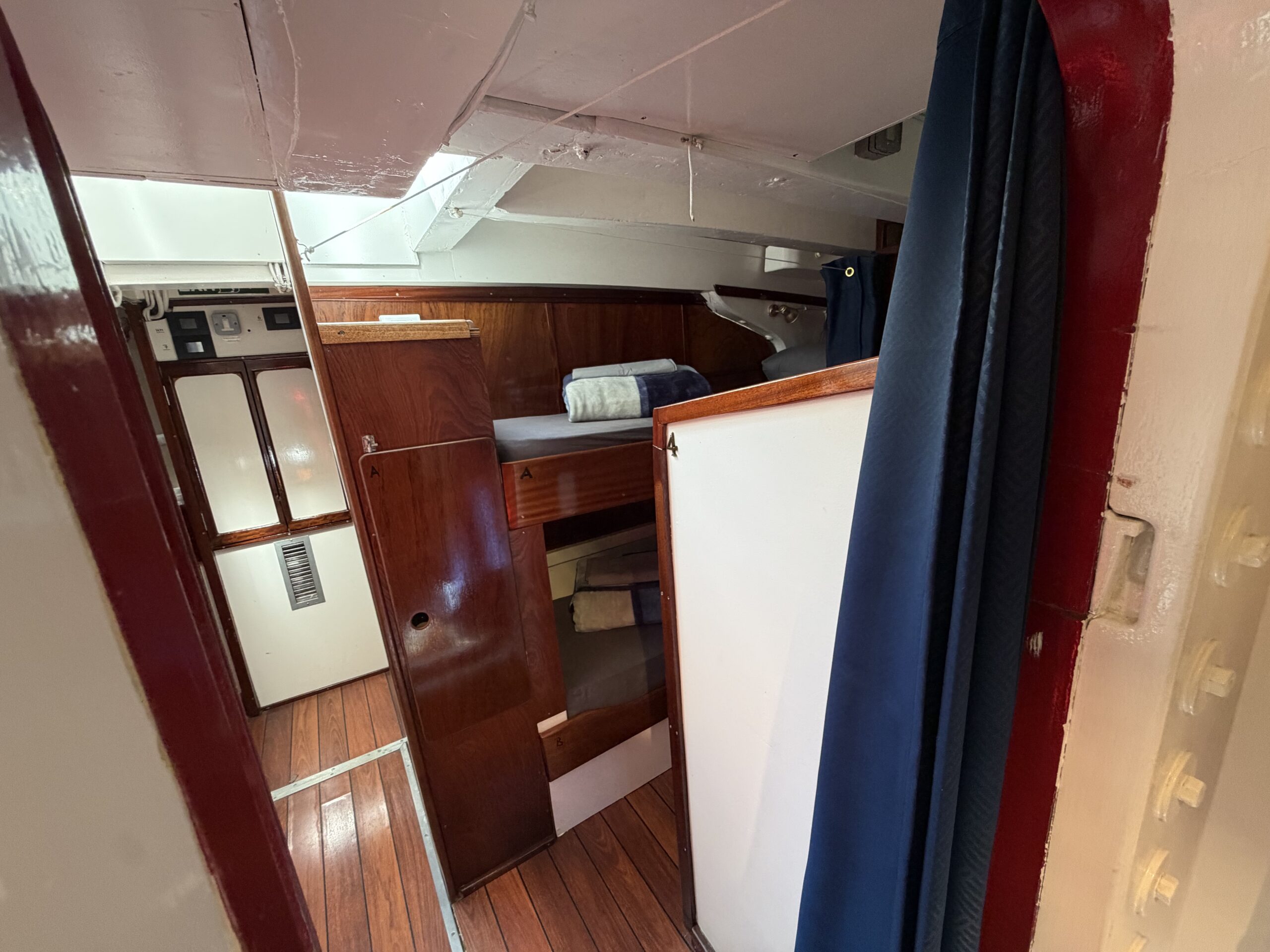 Die 4-Personen-Kabine ist offen und hat keine Tür zum Flur. Jedes Bett verfügt jedoch über einen eigenen Vorhang für mehr Privatsphäre. Das Waschbecken befindet sich im Flur und wird gemeinsam genutzt.