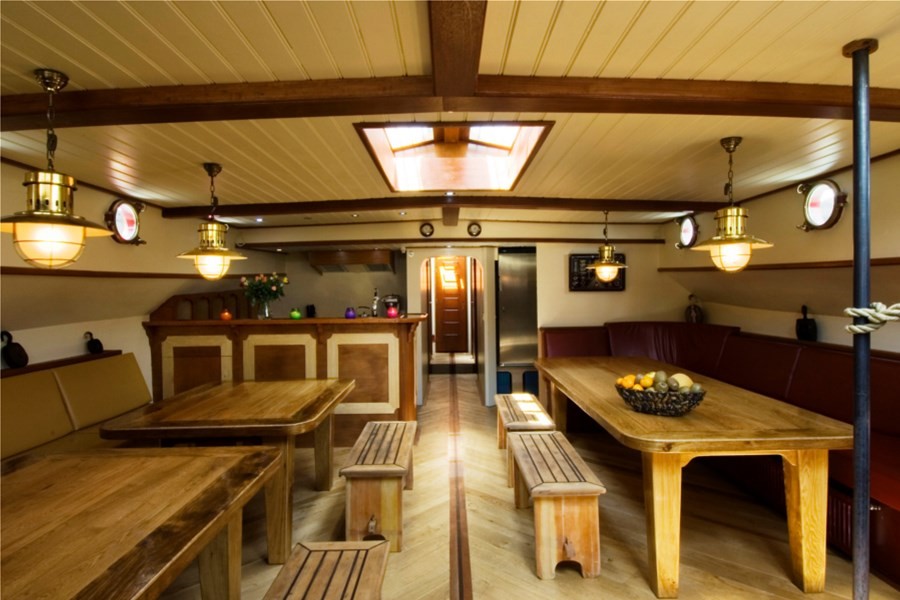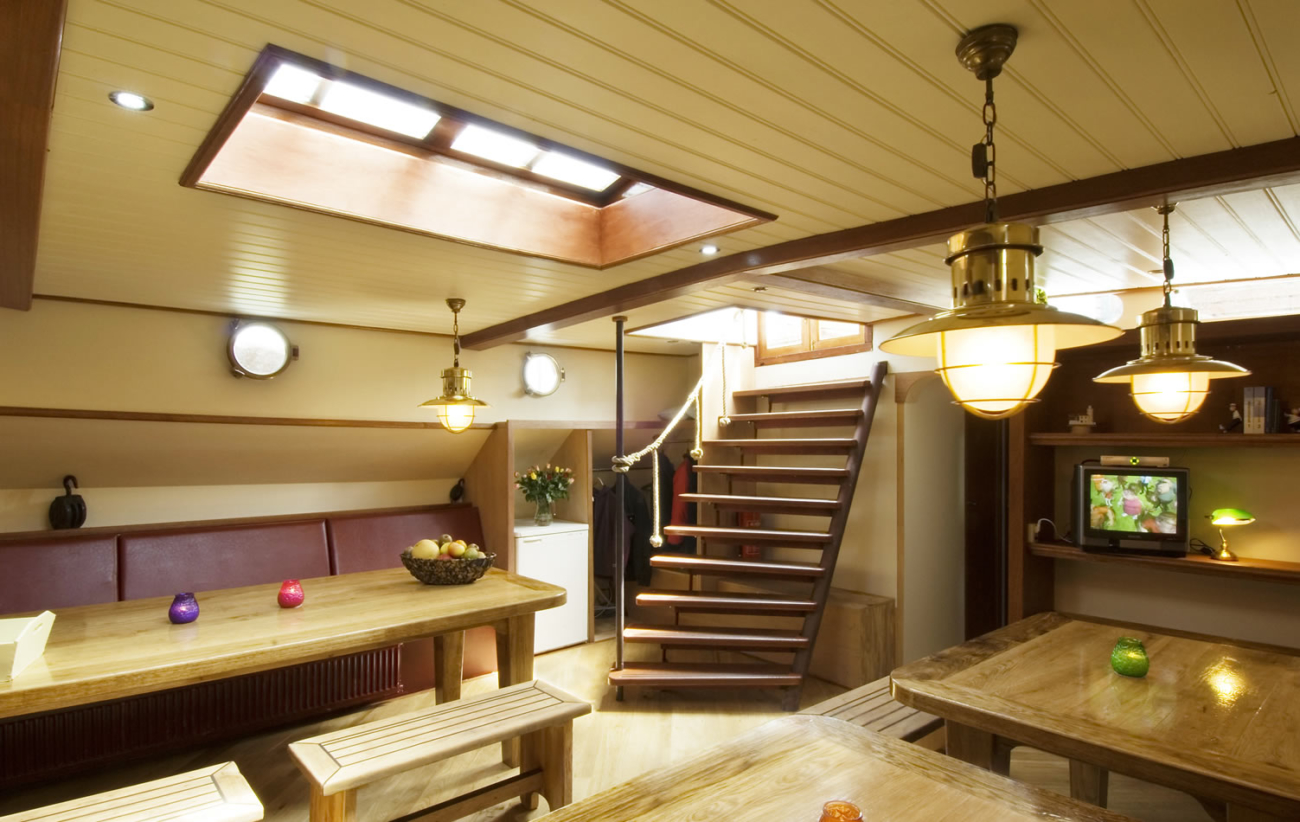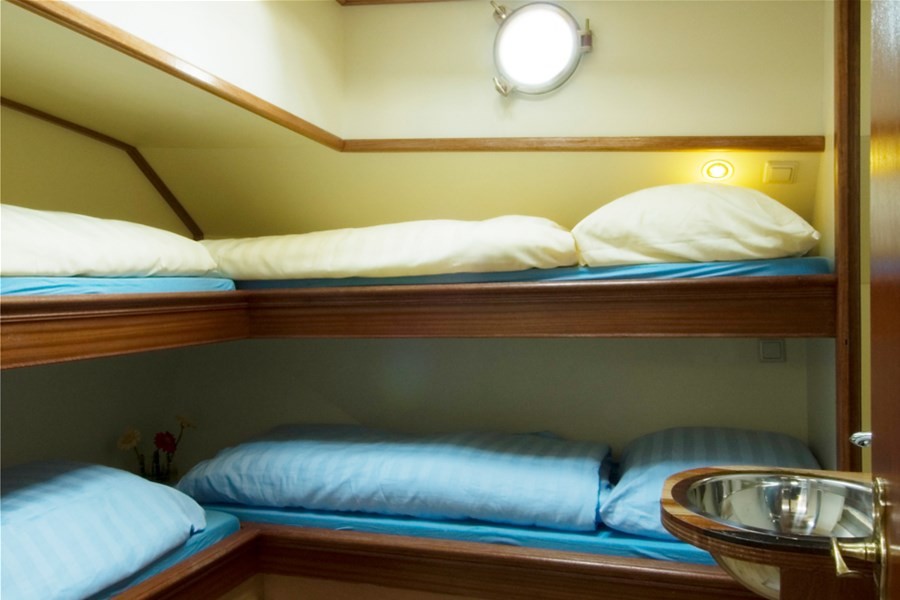 An Bord gibt es 20 Schlafplätze, verteilt auf 6 Zweibettkabinen und 2 Vierbettkabinen, jeweils mit Zugang zu einer der vier Duschen und Toiletten. Dank der Zentralheizung ist das gesamte Schiff auch in der Nebensaison angenehm warm.