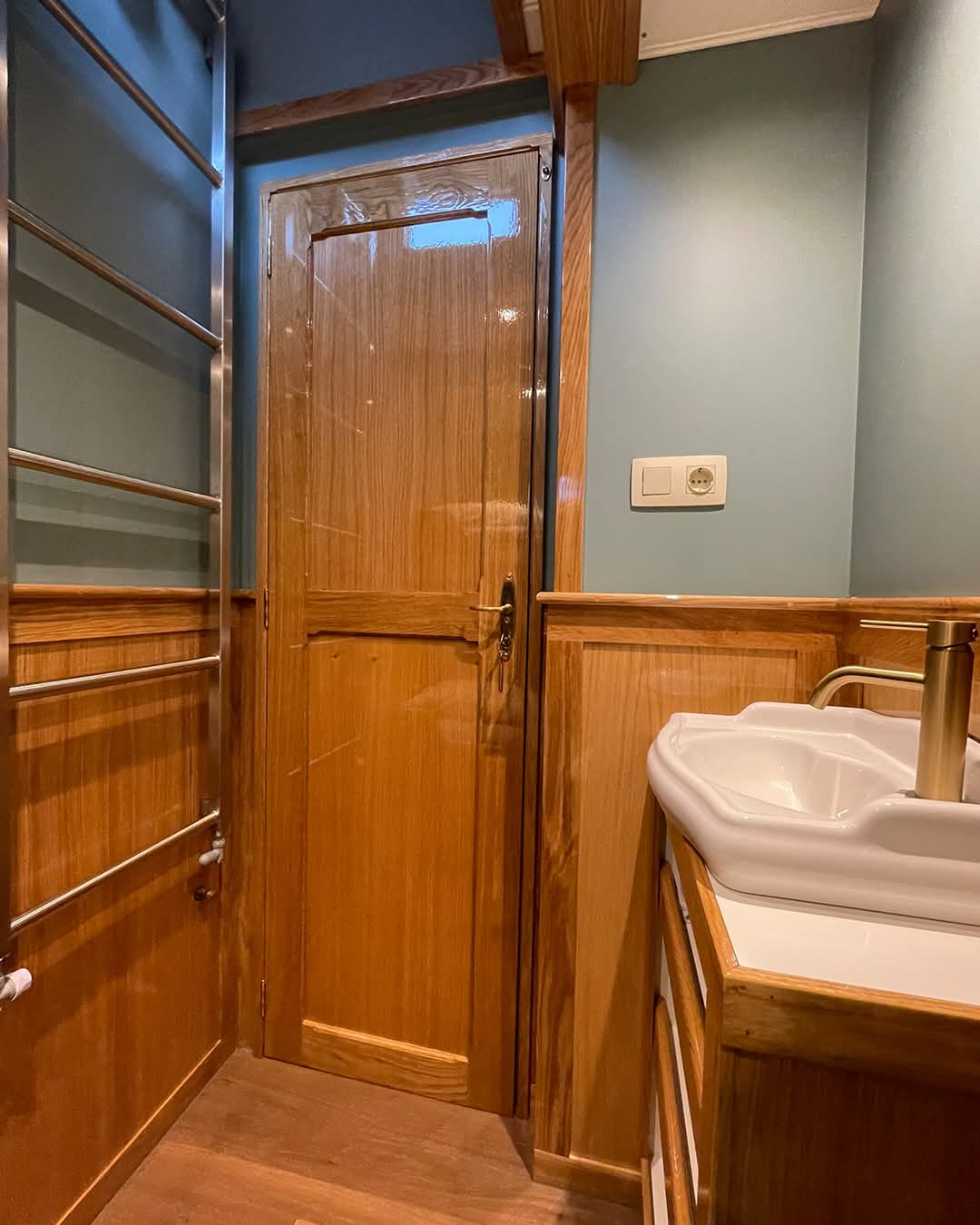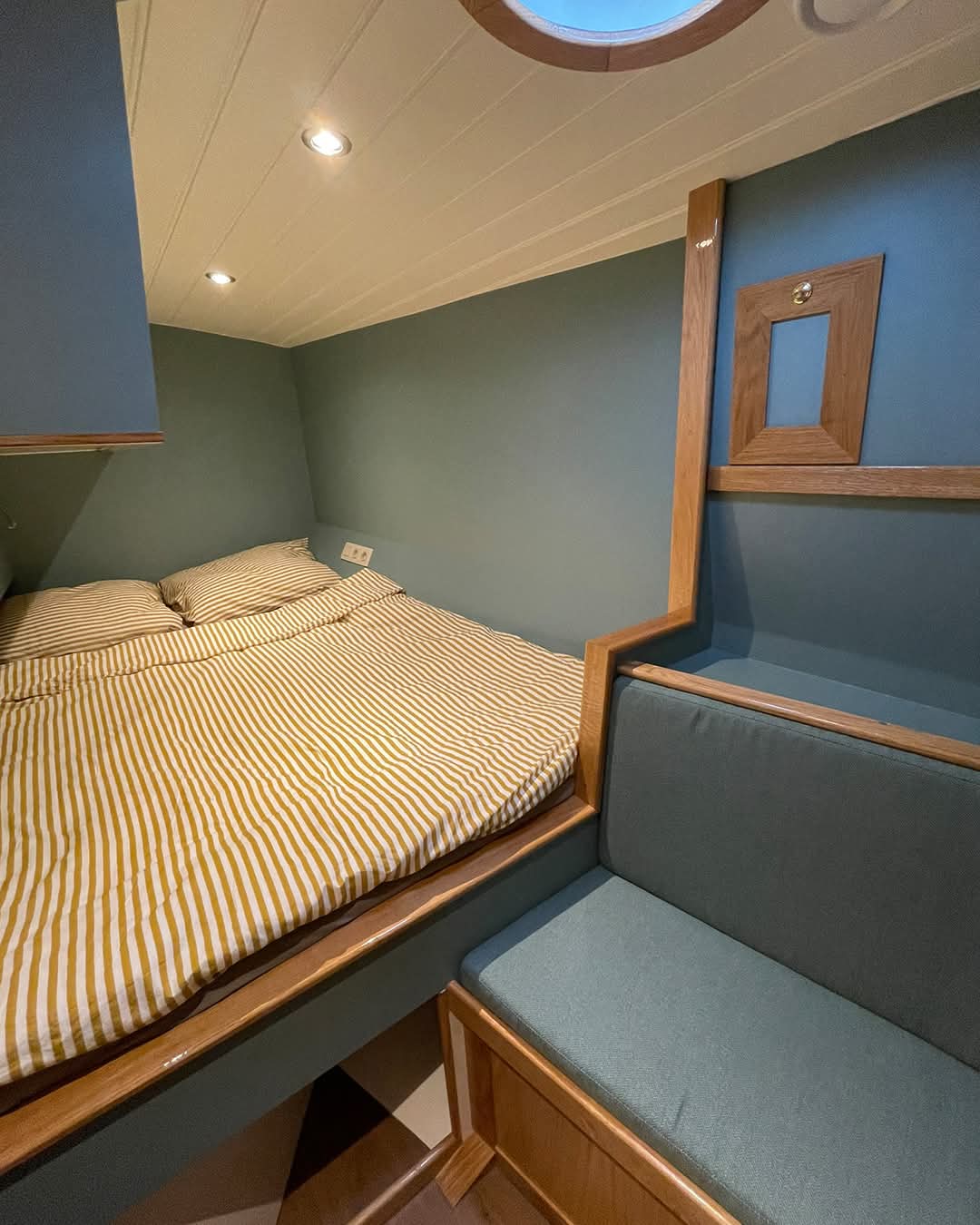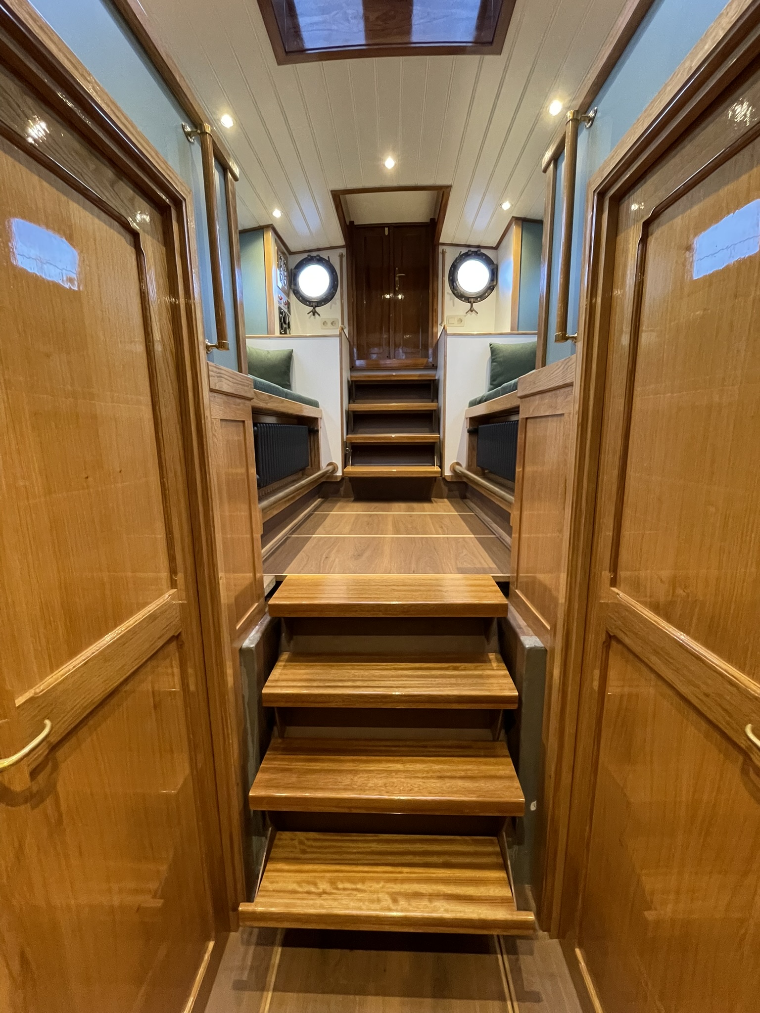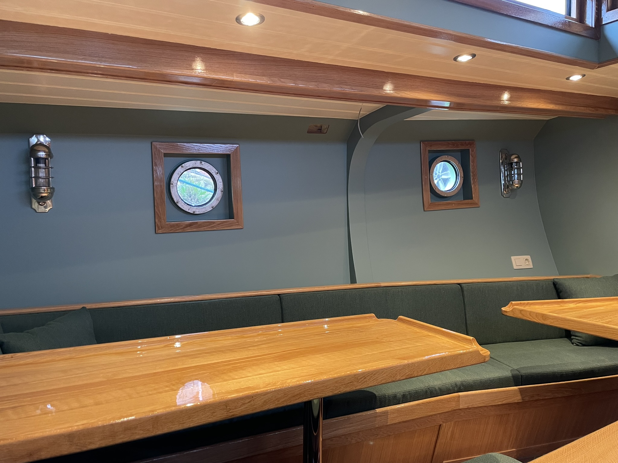 Das Interieur der Quadra ist für eine Yacht außergewöhnlich geräumig, hell und einladend, mit vielen schönen Akzenten aus Eichenholz und Mahonie. Alles ganz neu und mit viel Liebe und Fachkenntnis im Jahr 2025 eingebaut.