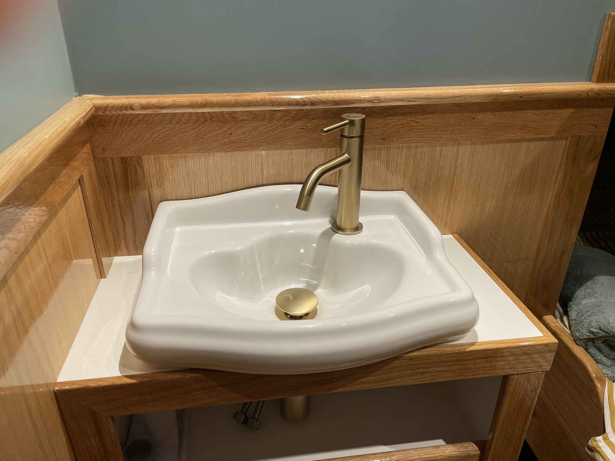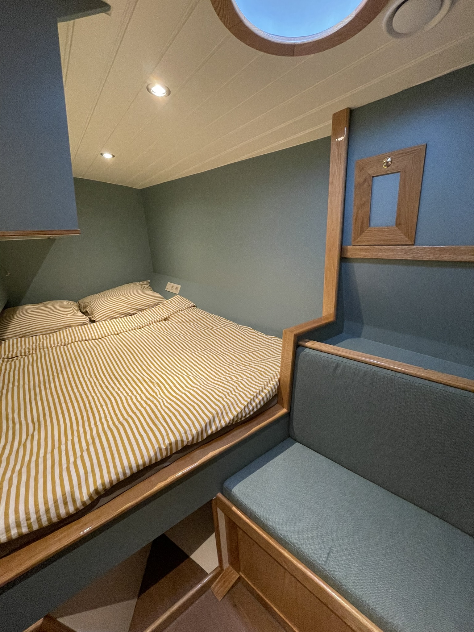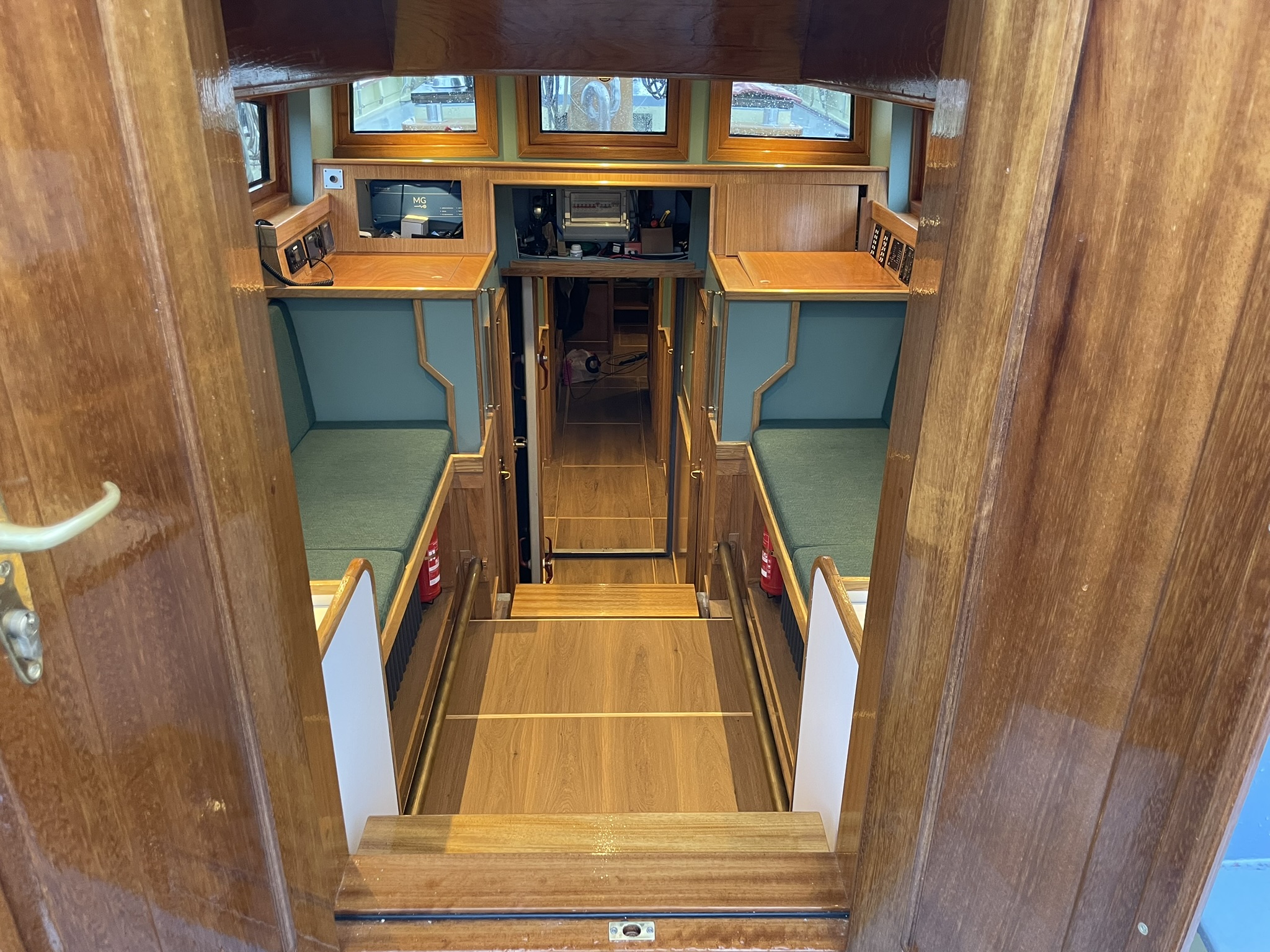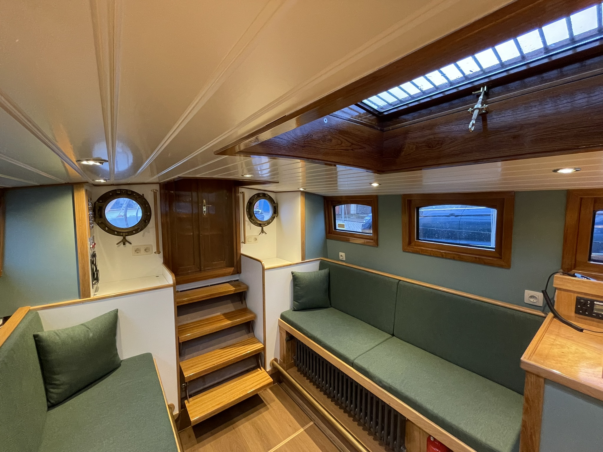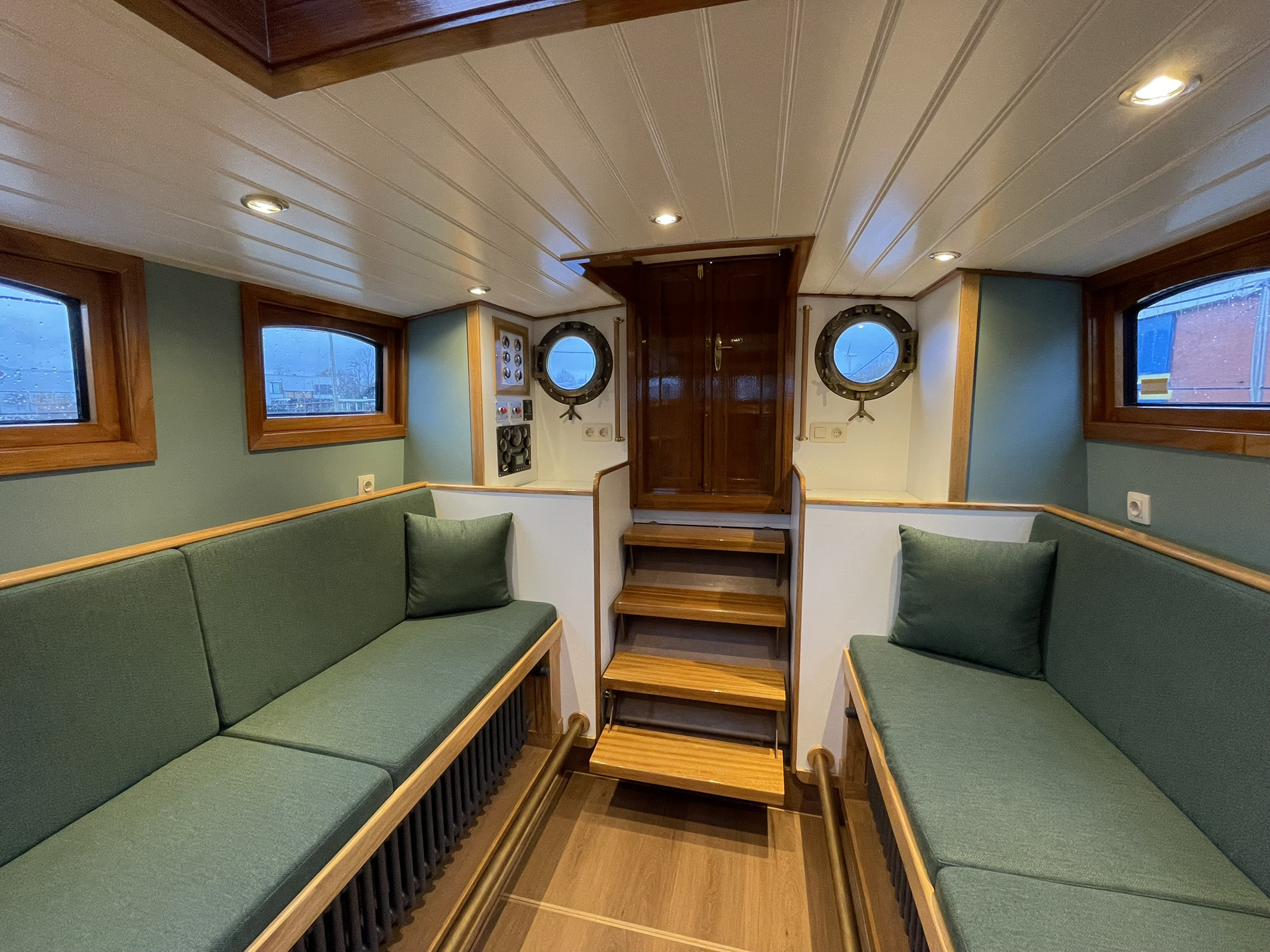 Das Interieur der Quadra ist für eine Yacht außergewöhnlich geräumig, hell und einladend, mit vielen schönen Akzenten aus Eichenholz und Mahonie. Alles ganz neu und mit viel Liebe und Fachkenntnis im Jahr 2025 eingebaut.