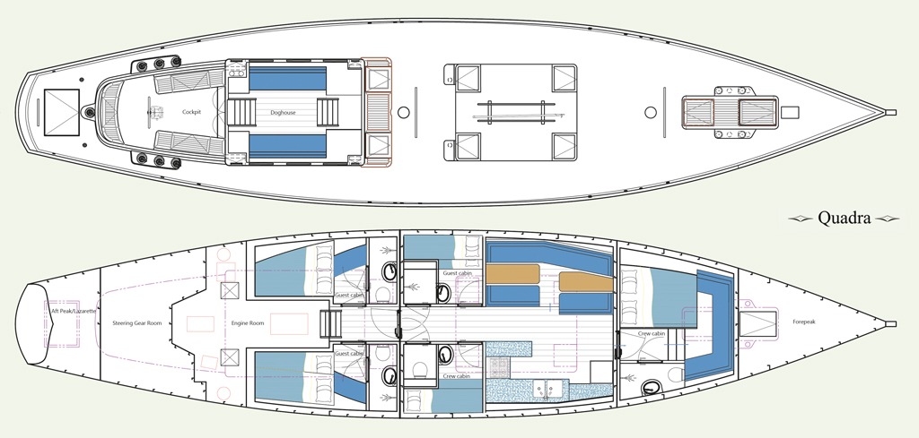 Die Quadra bietet Platz für maximal sechs Gäste und vier Besatzungsmitglieder, was für eine persönliche Atmosphäre sorgt. Die Gäste schlafen in Doppelkabinen mit Doppelbett und eigenem Bad oder in einer Doppelkabine mit Etagenbett und gemeinsamem Bad auf dem Flur.